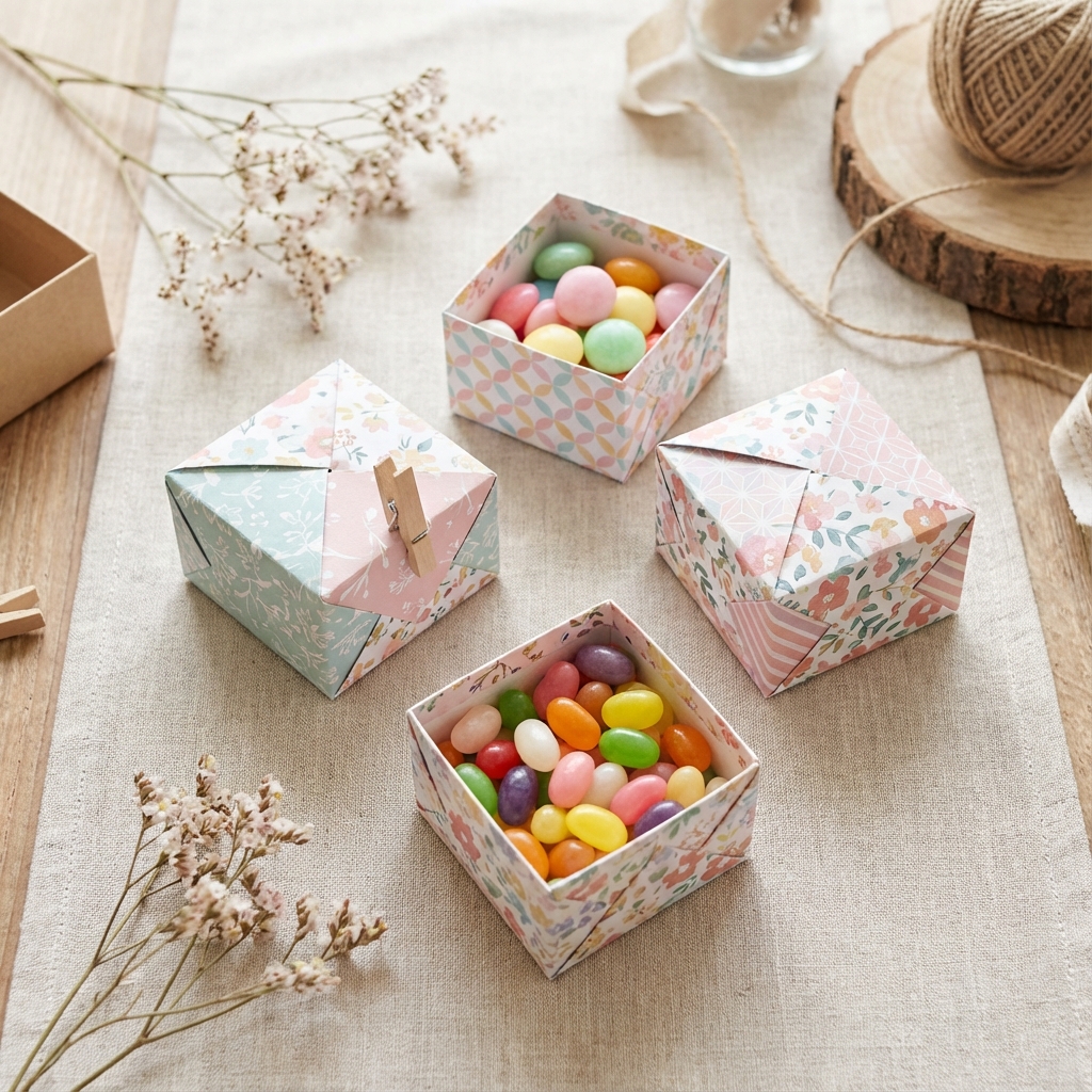 Pequeñas cajitas de papel doblado que parecen tesoros. Son perfectas si quieres evitar el plástico por completo y usar papeles bonitos.