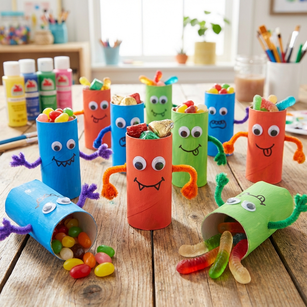 Recicla los rollos de papel higiénico para crear divertidos personajes que “vomitan” chuches. ¡A los niños les hace muchísima gracia y es una manualidad genial para hacer en familia!