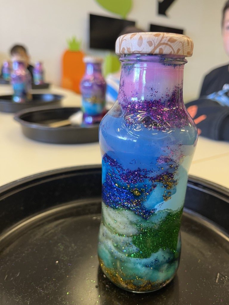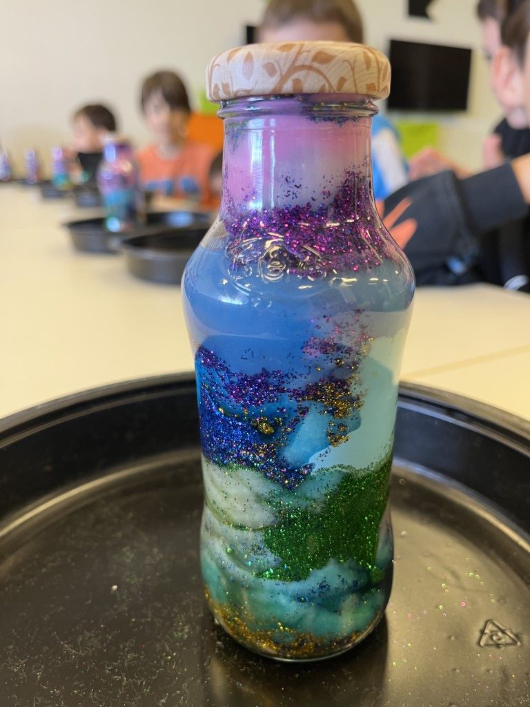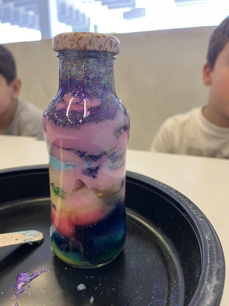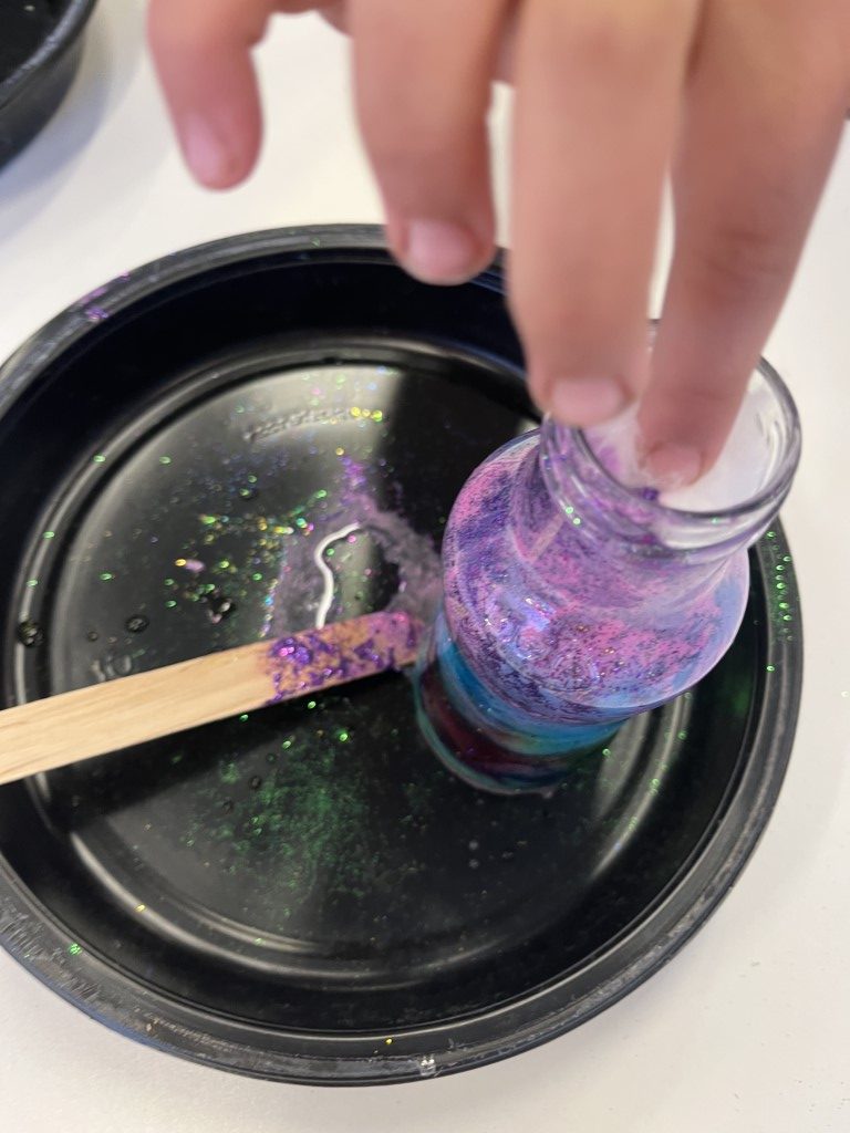 Cada peke pudo “encerrar” un trocito de galaxia en un bote de cristal fue un espectáculo de color. ¿Alguna vez has soñado con tener un trocito de galaxia en tu mesita de noche. Aprovechamos que las nebulosas son auténticas “guarderías estelares” para que nuestros pequeños astronautas crearan las suyas propias.