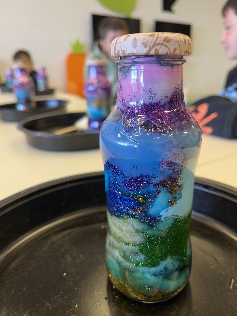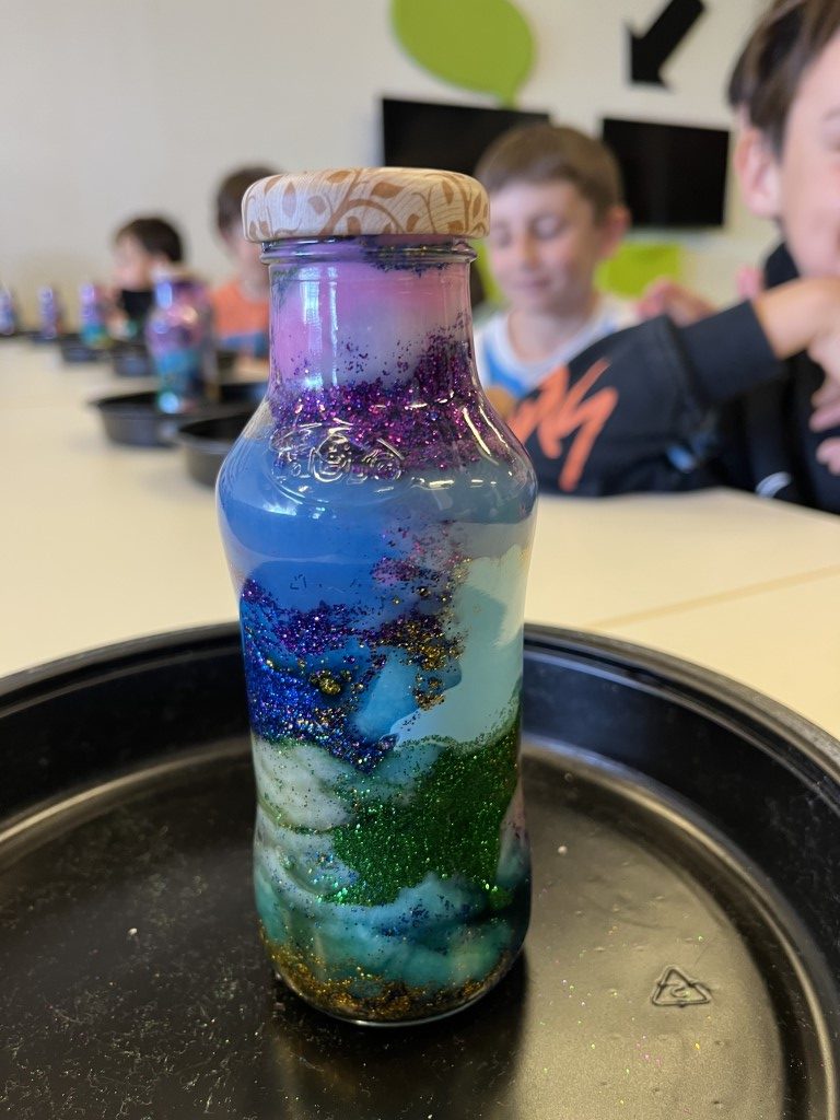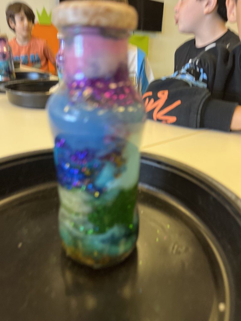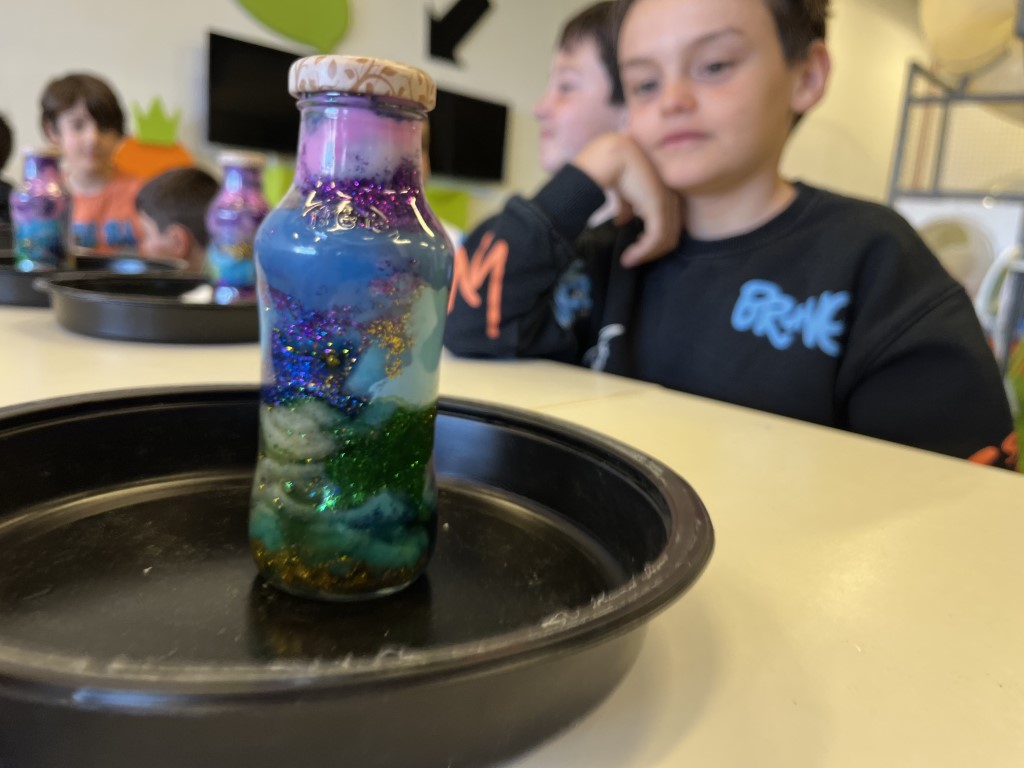 Cada peke pudo “encerrar” un trocito de galaxia en un bote de cristal fue un espectáculo de color. ¿Alguna vez has soñado con tener un trocito de galaxia en tu mesita de noche. Aprovechamos que las nebulosas son auténticas “guarderías estelares” para que nuestros pequeños astronautas crearan las suyas propias.