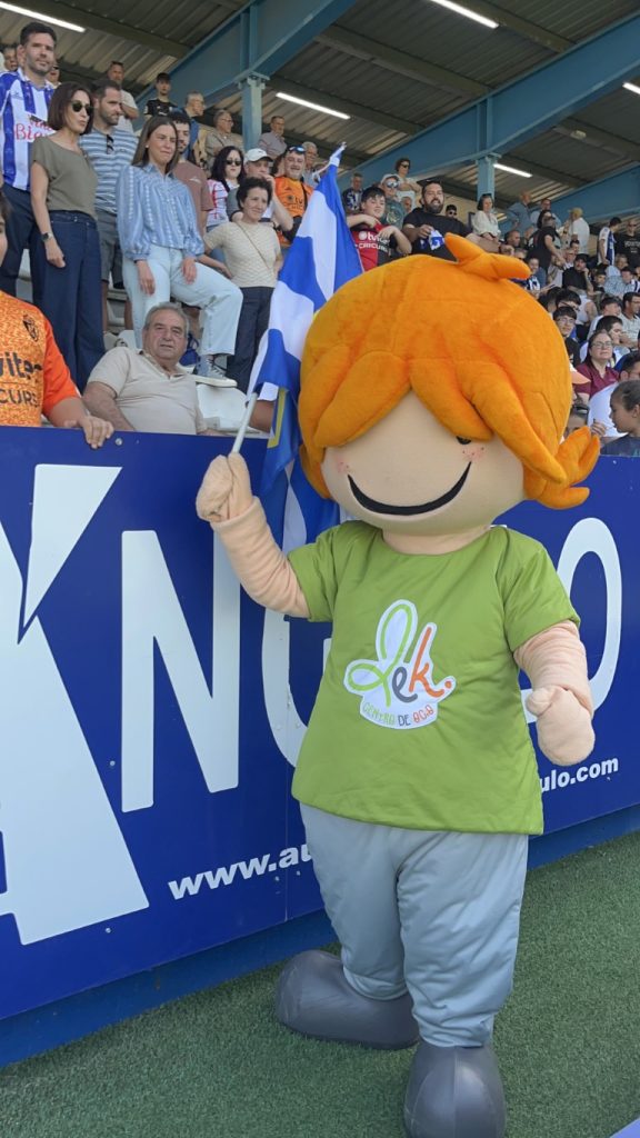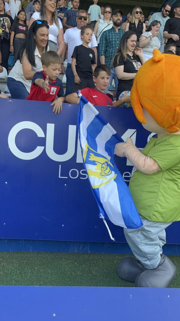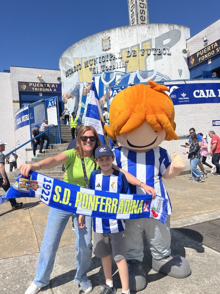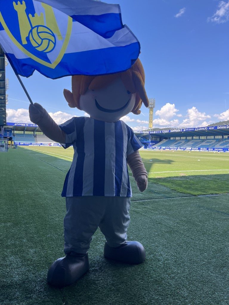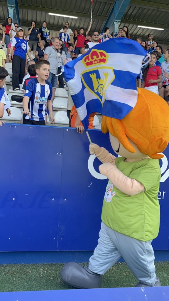 Leko saltó al césped de El Toralín convertidose en el auténtico alma de la fiesta. Con el sol brillando sobre el estadio “solo los que estábamos allí, sabemos el calor que hacia” Leko se lanzó al terreno de juego con una energía inagotable, ondeando con fuerza la bandera blanquiazul mientras recorría la banda para jalear a la grada. Su presencia transformó los quince minutos de pausa en un espectáculo de color y orgullo berciano.
