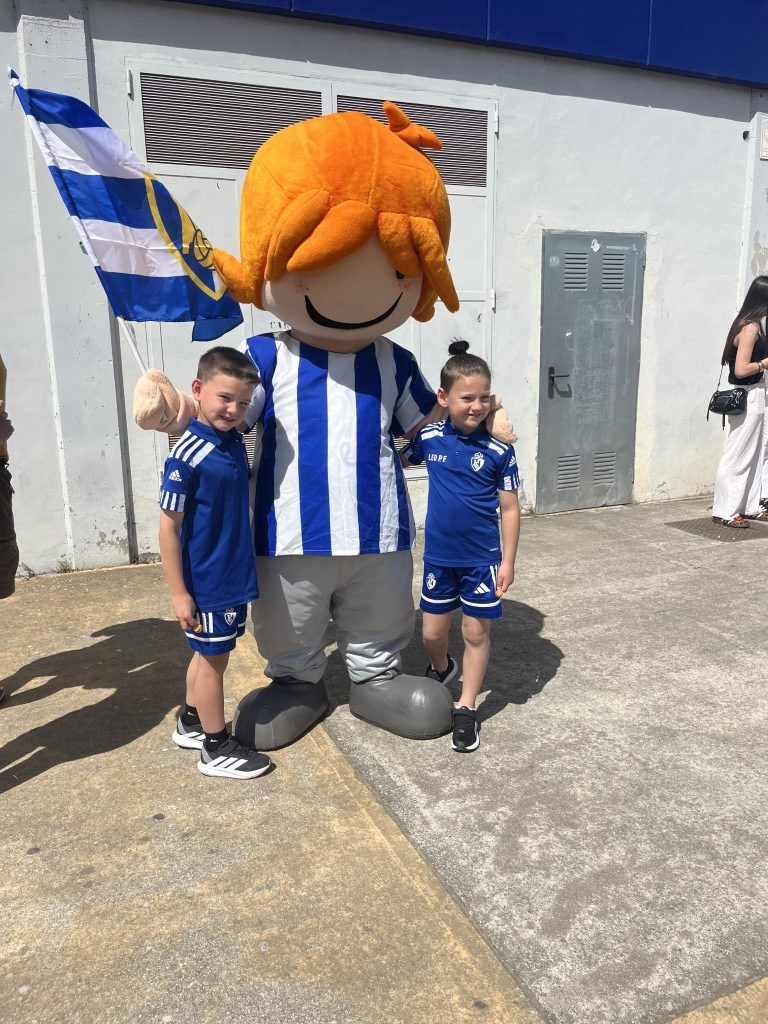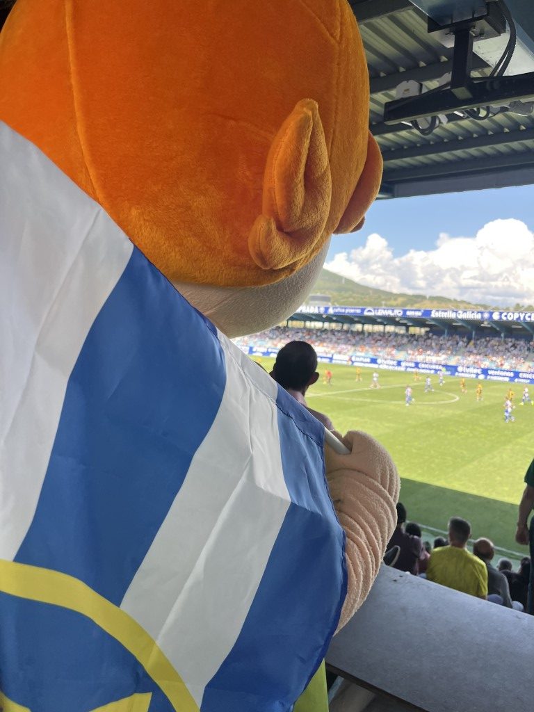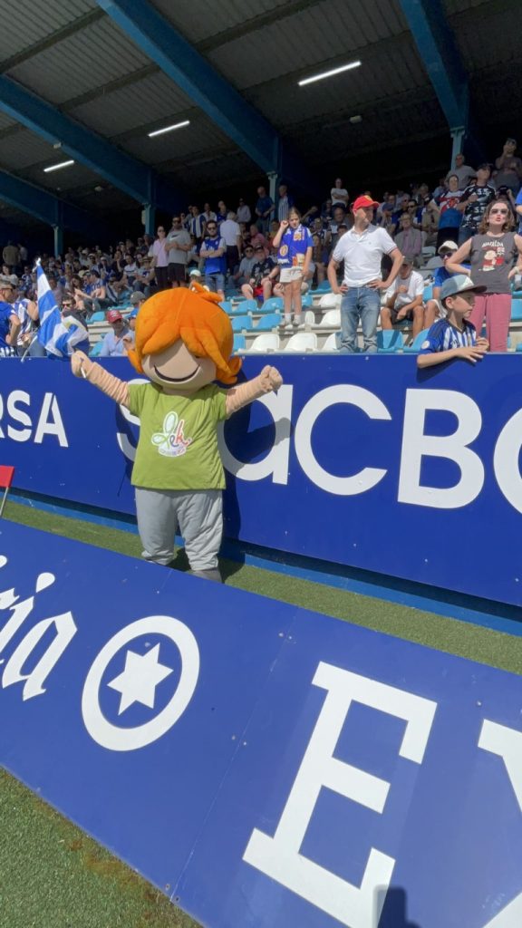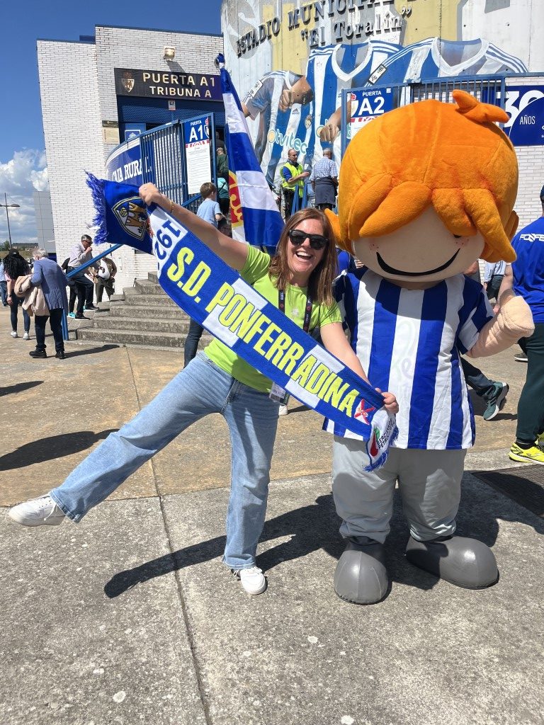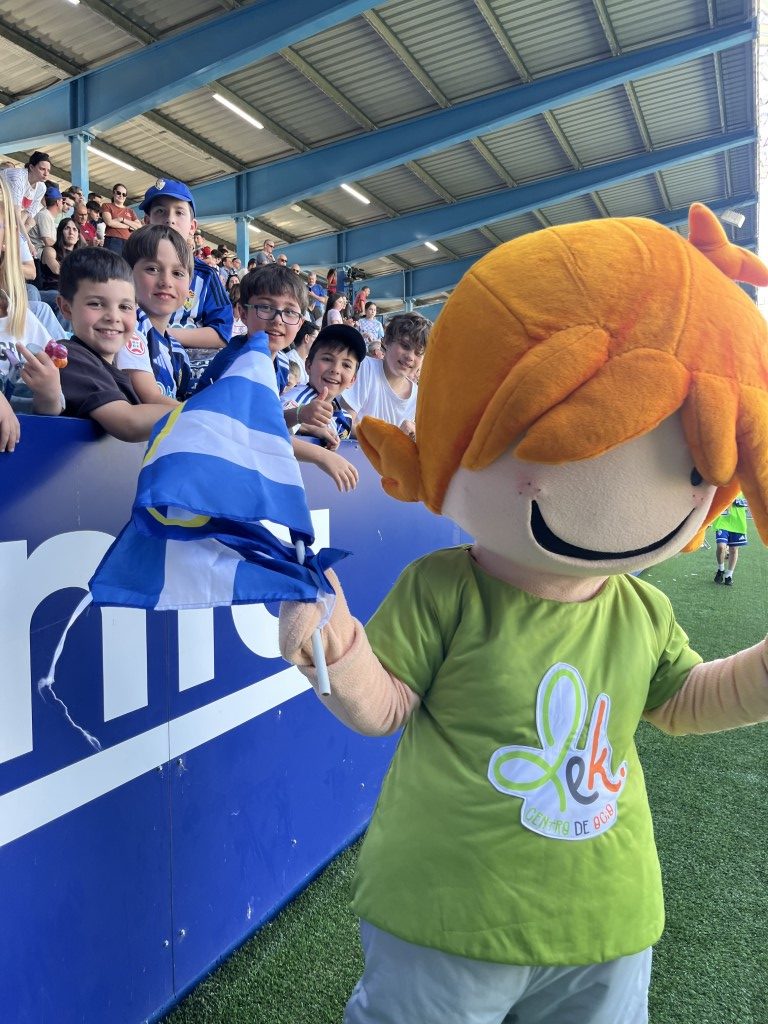 Leko saltó al césped de El Toralín convertidose en el auténtico alma de la fiesta. Con el sol brillando sobre el estadio “solo los que estábamos allí, sabemos el calor que hacia” Leko se lanzó al terreno de juego con una energía inagotable, ondeando con fuerza la bandera blanquiazul mientras recorría la banda para jalear a la grada. Su presencia transformó los quince minutos de pausa en un espectáculo de color y orgullo berciano.
